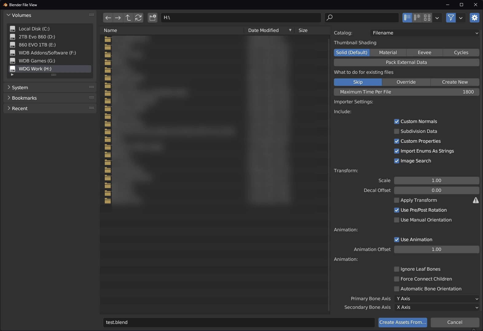 Once you select this option, a blender file viewer will open. From here you need to either select a directory with FBX files in, OR select an FBX file. TrueASSETS can auto-import multiple files by recursively searching through sub-directories for the requested file types; just navigate to a directory that has sub-directories in with the needed files and then finish the process.