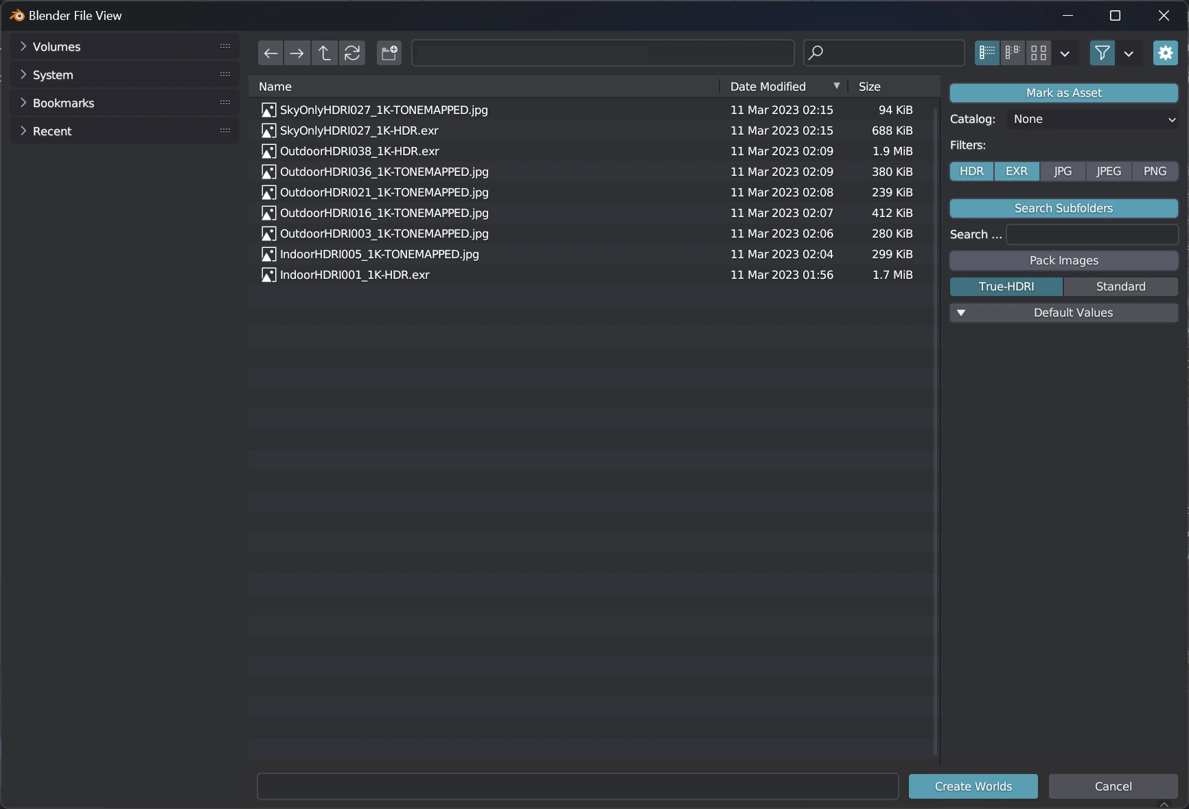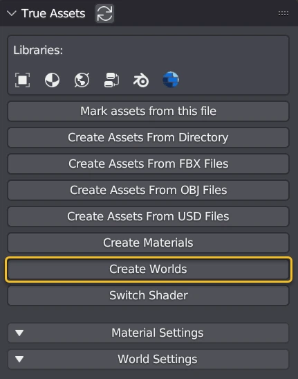 The Creating Worlds feature in TrueASSETS allows users to generate world shaders by converting 360 HDR images into usable worlds inside Blender. This documentation provides an overview of the process,and various options available during the world shader creation.